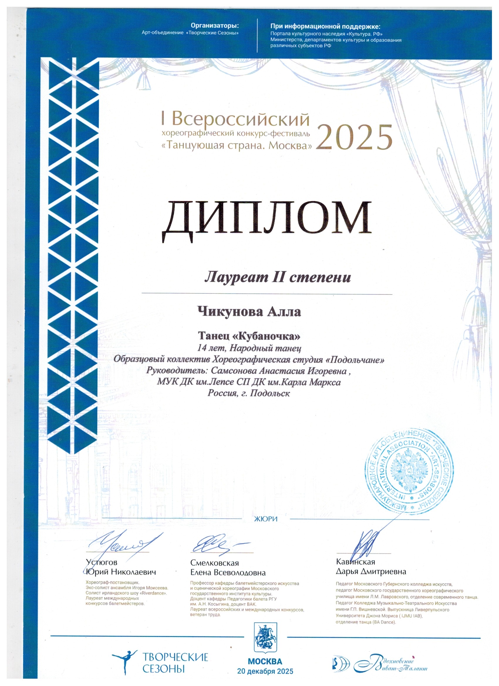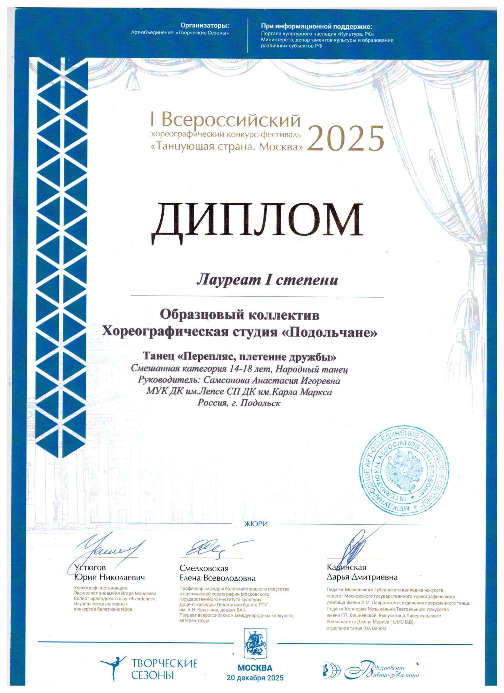 20 декабря Образцовый коллектив «Хореографическая студия «Подольчане»» с блестящим результатом выступил на I Всероссийском хореографическом конкурсе-фестивале «Танцующая страна» в Москве.