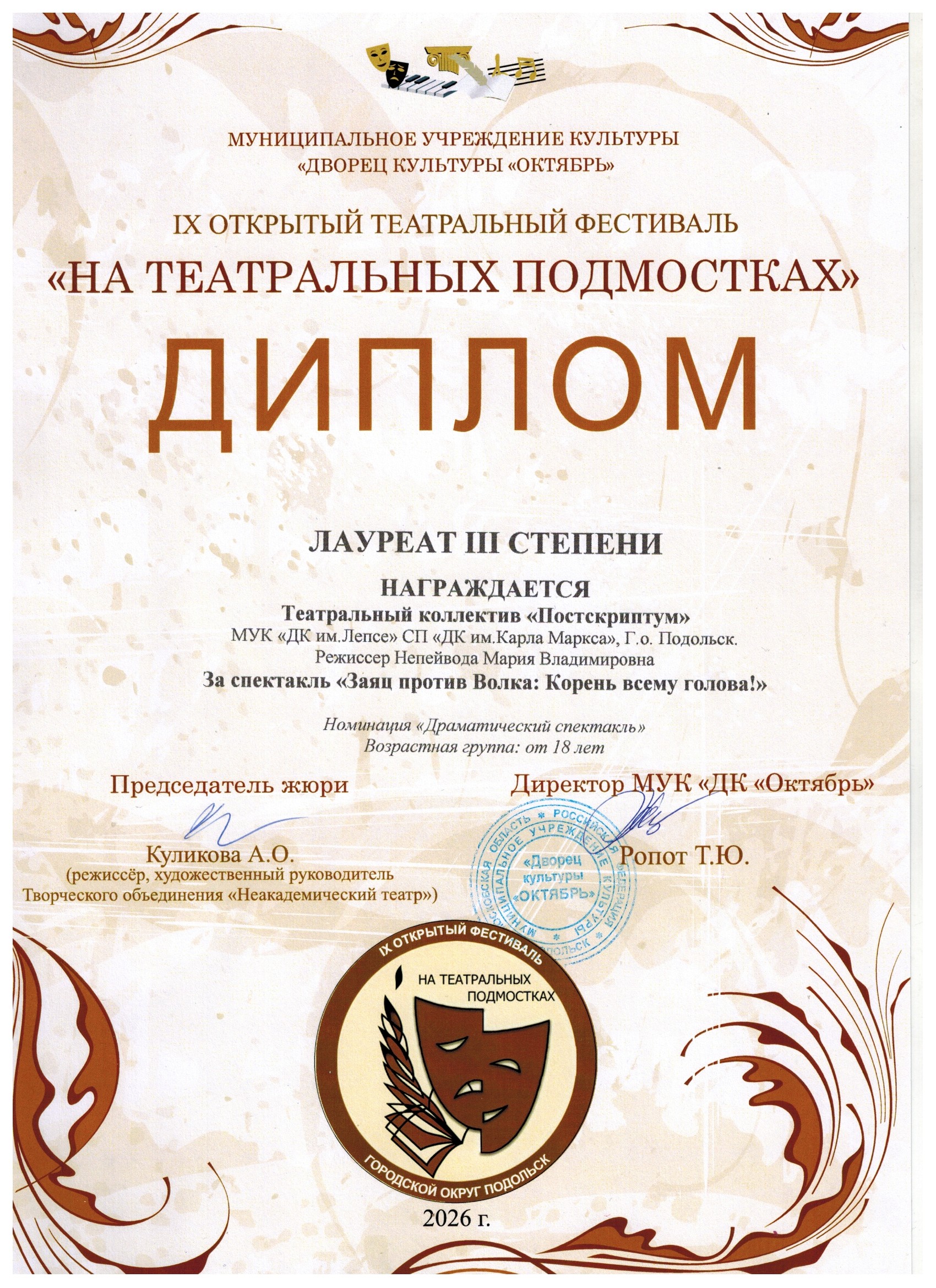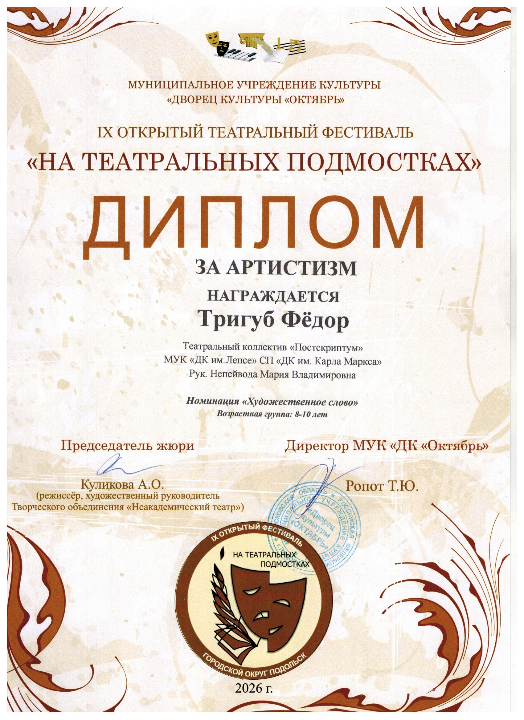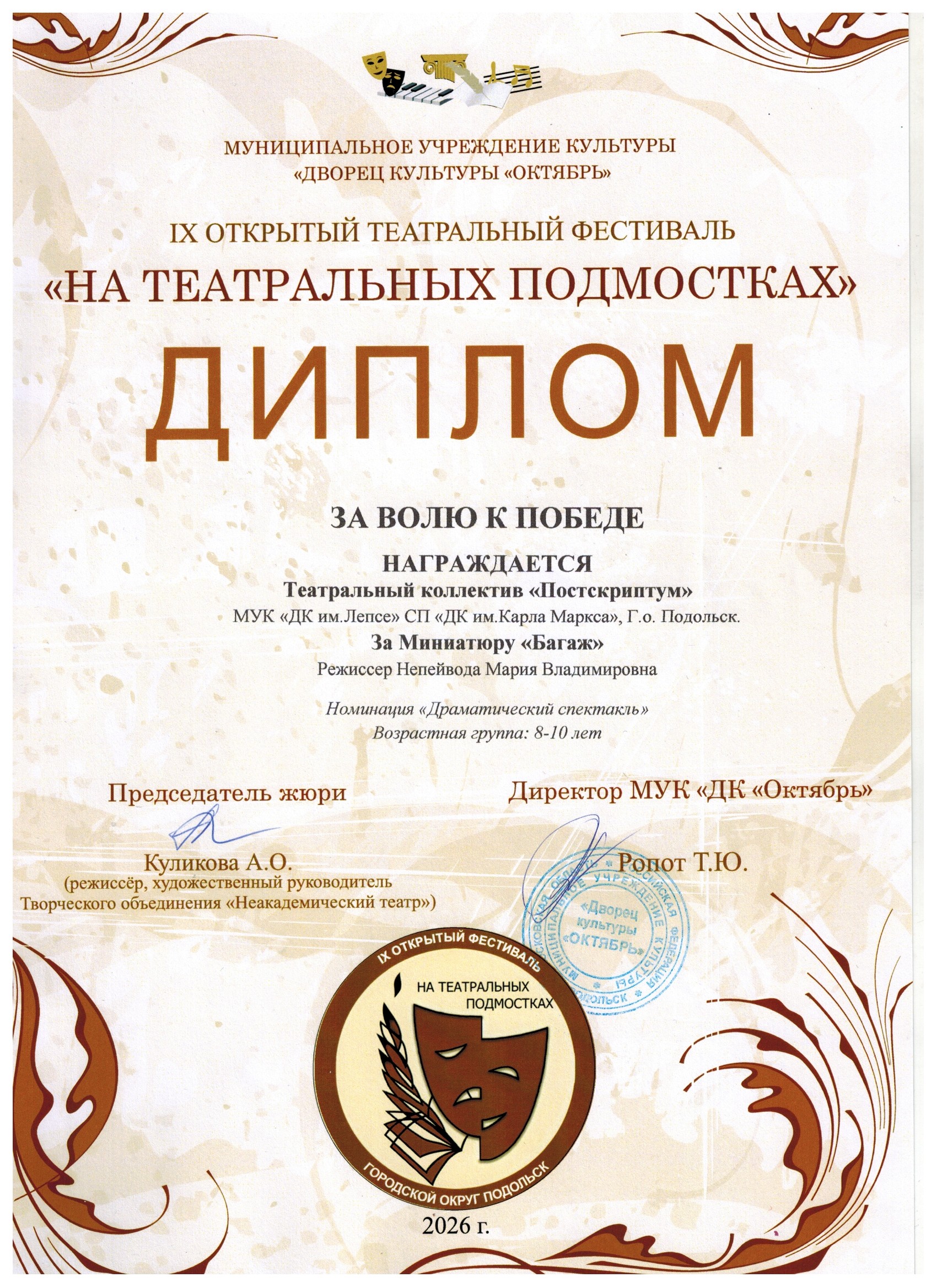 8 апреля во Дворце культуры «Октябрь» состоялся большой праздник для любителей театрального искусства. Воспитанники Марии Непейвода из «Постскриптума» заняли почетные призовые места.