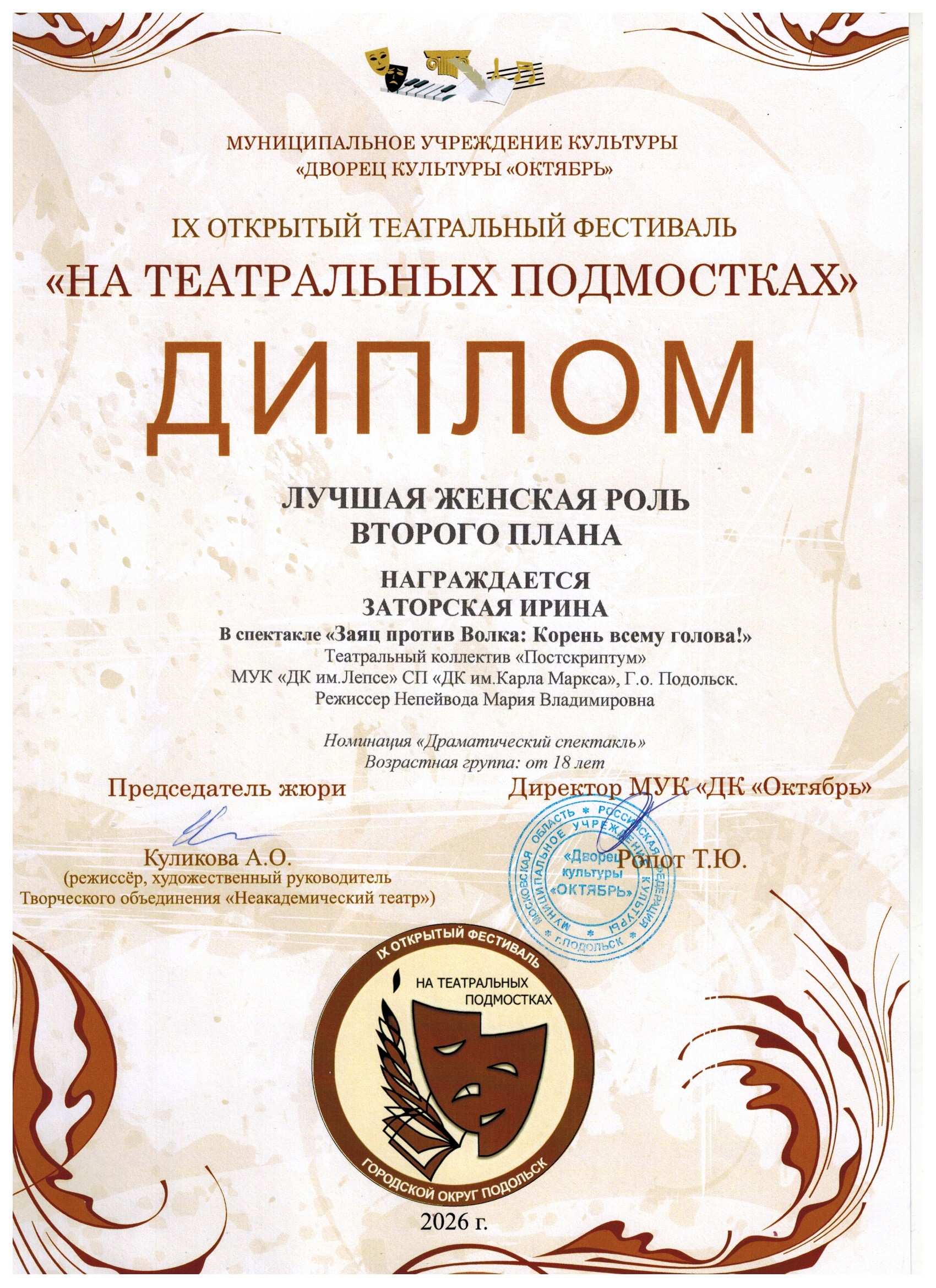 Заторская Ирина — Диплом лучшая женская роль второго плана.