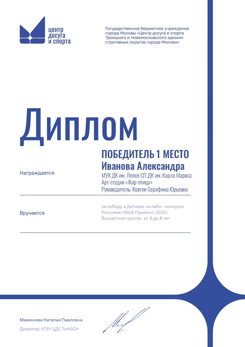 Иванова Александра заняла 1 место (в возрастной группе 6-8 лет)