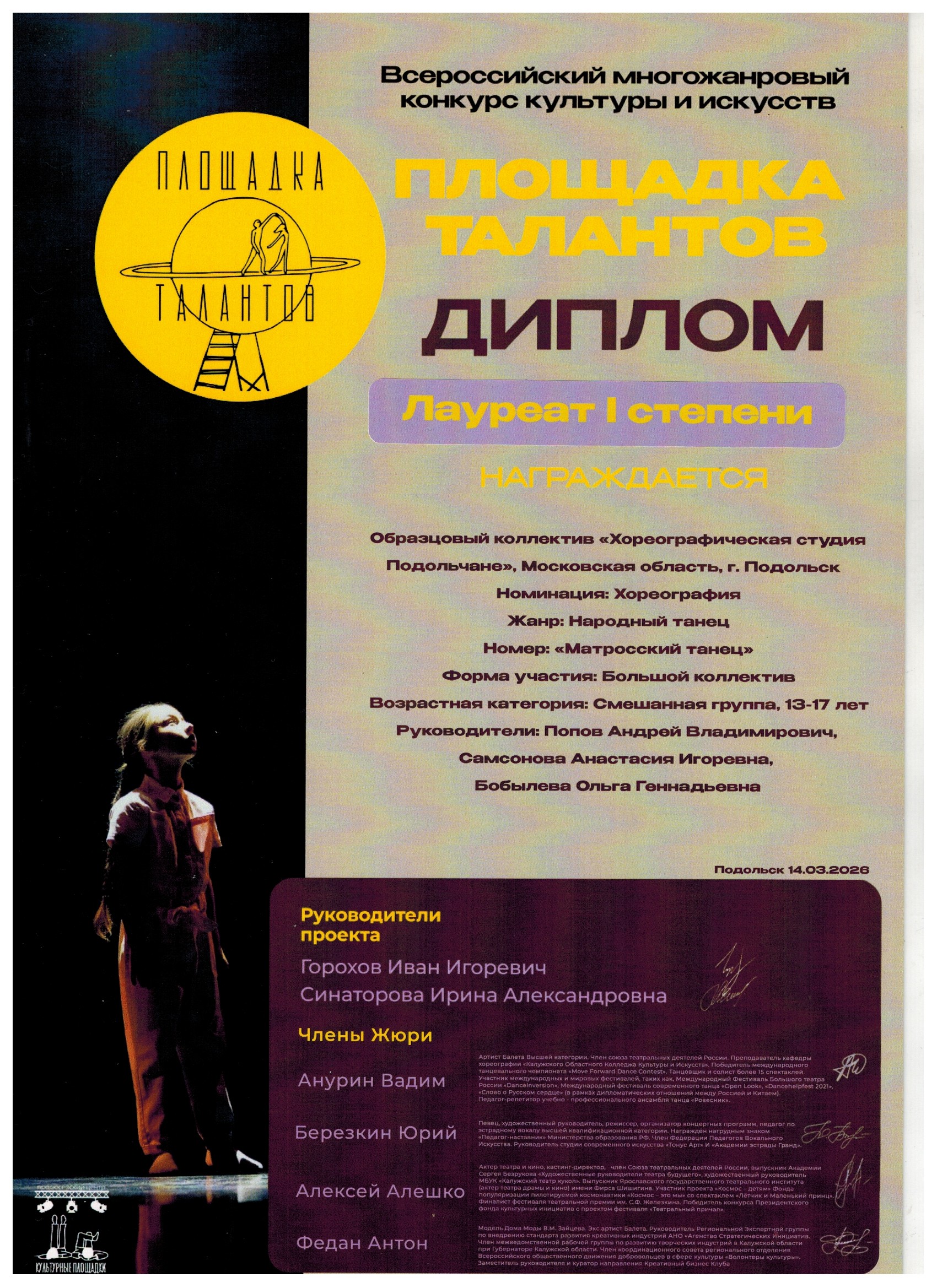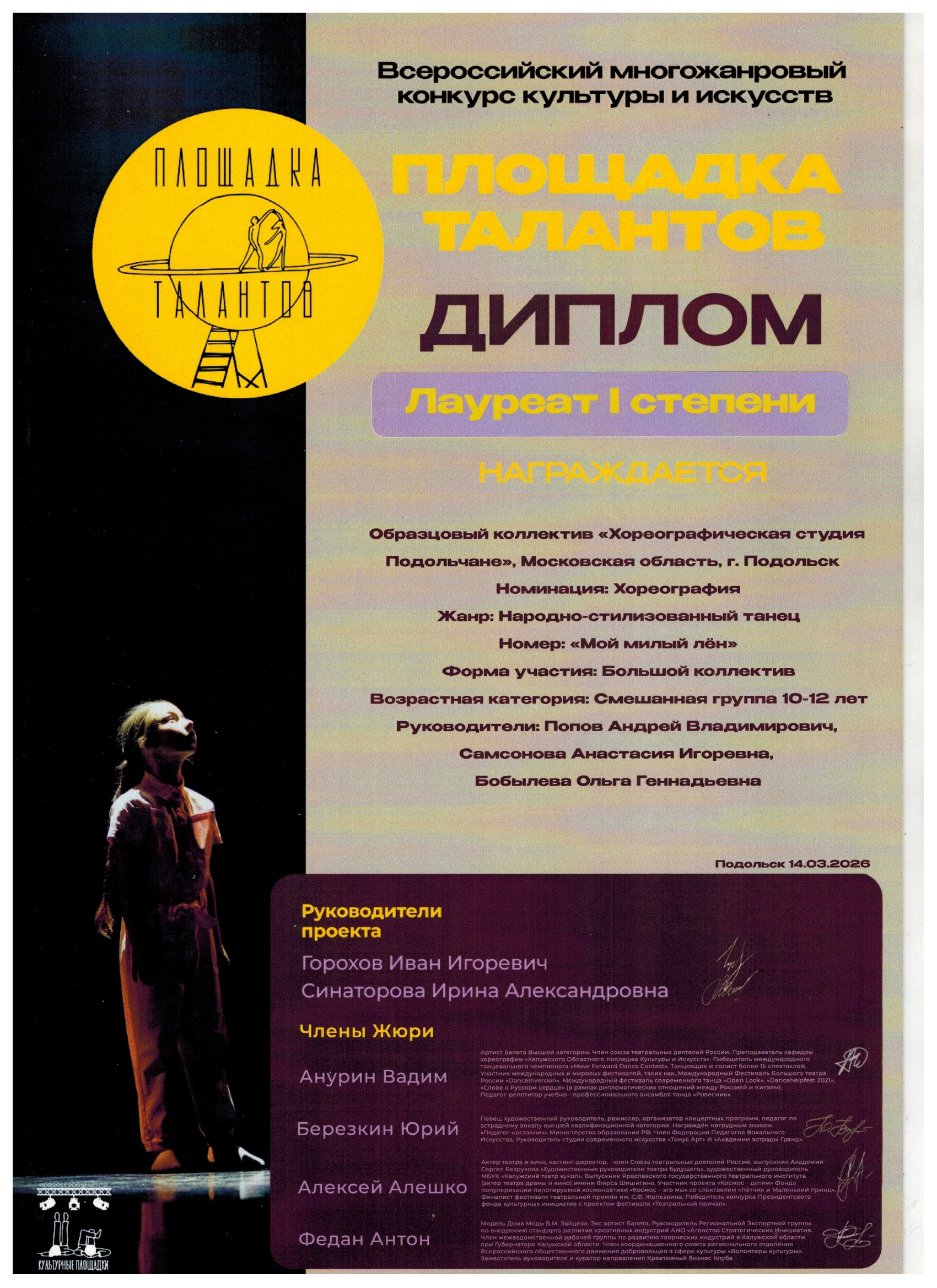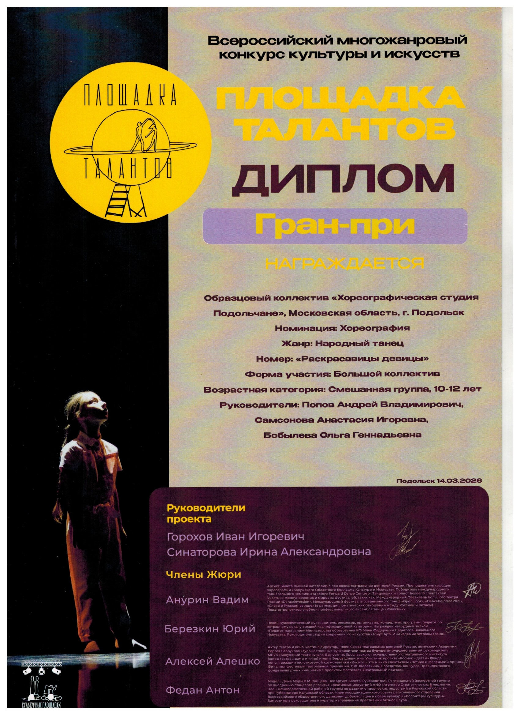 14 марта Хореографическая студия «Подольчане» успешно выступила на Всероссийском конкурсе культуры и искусств «Площадка Талантов» Образцовый коллектив хореографическая студия «Подольчане» представил на суд жюри девять хореографических номеров.