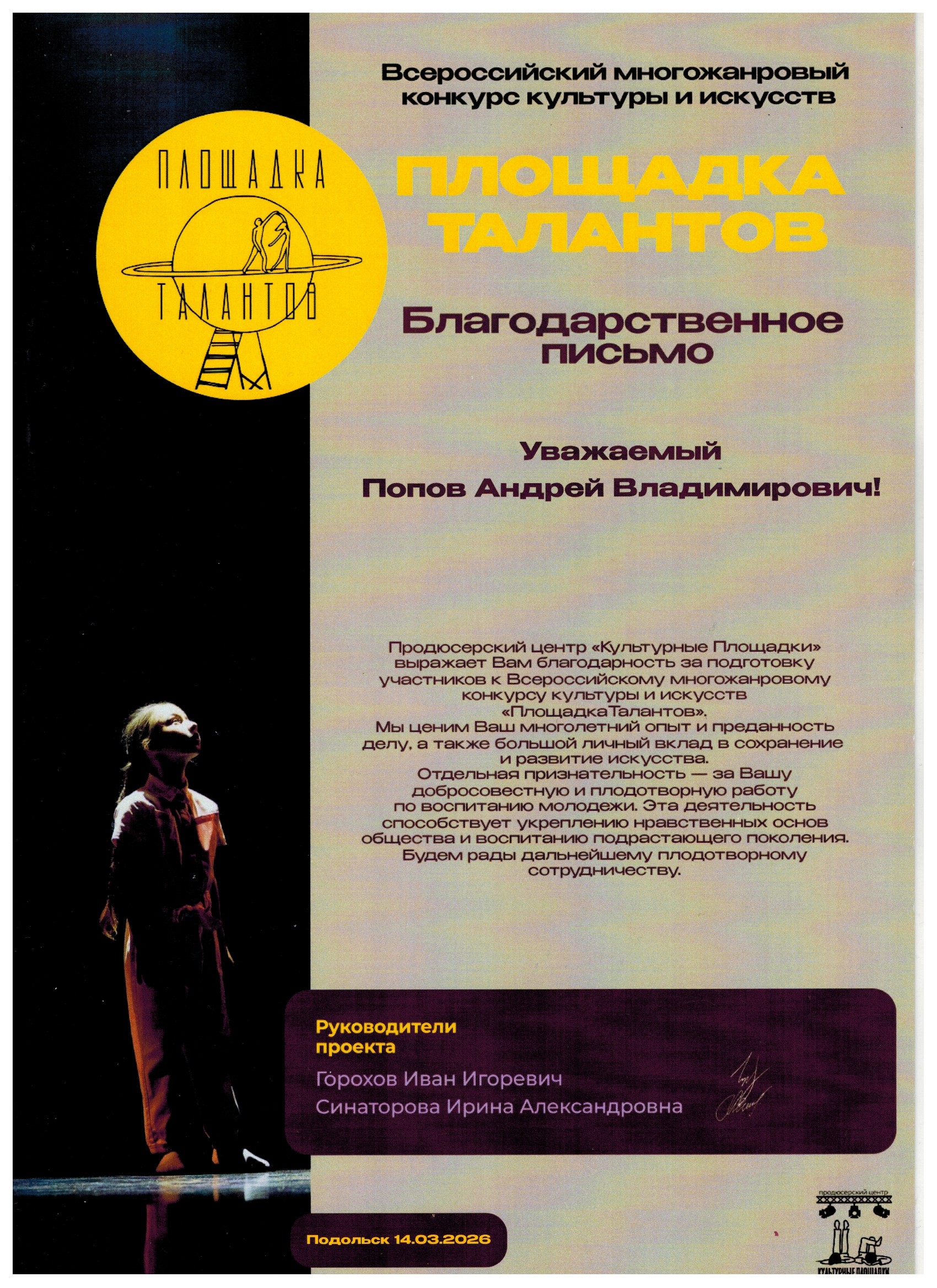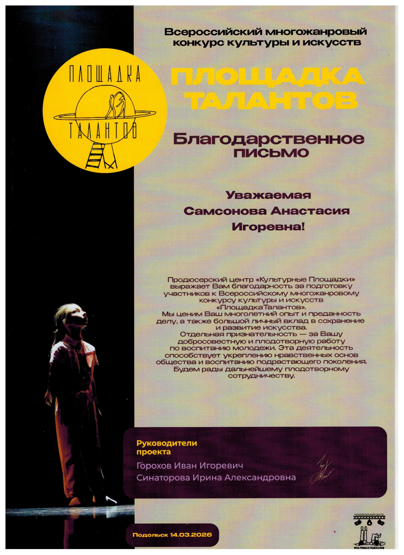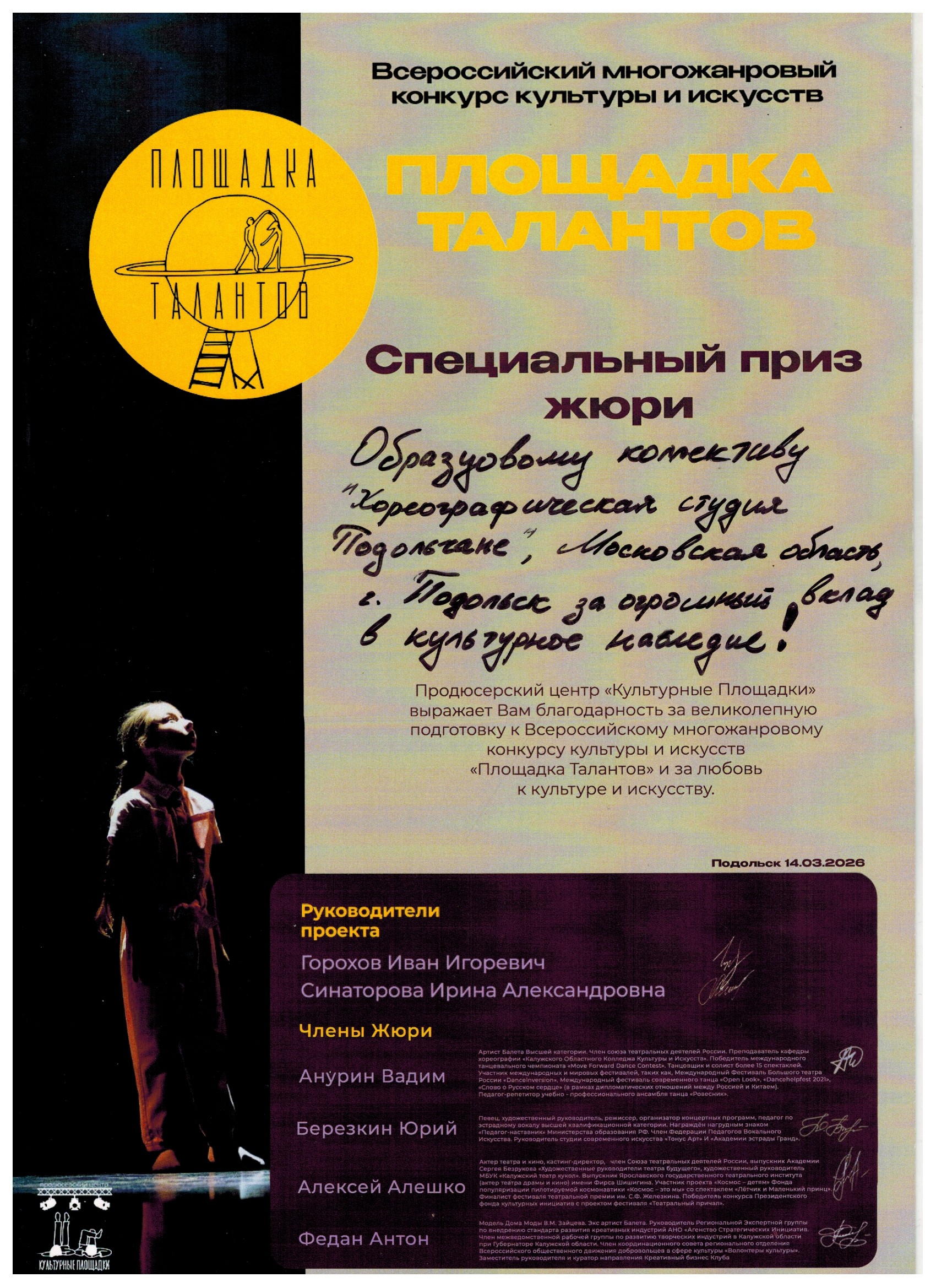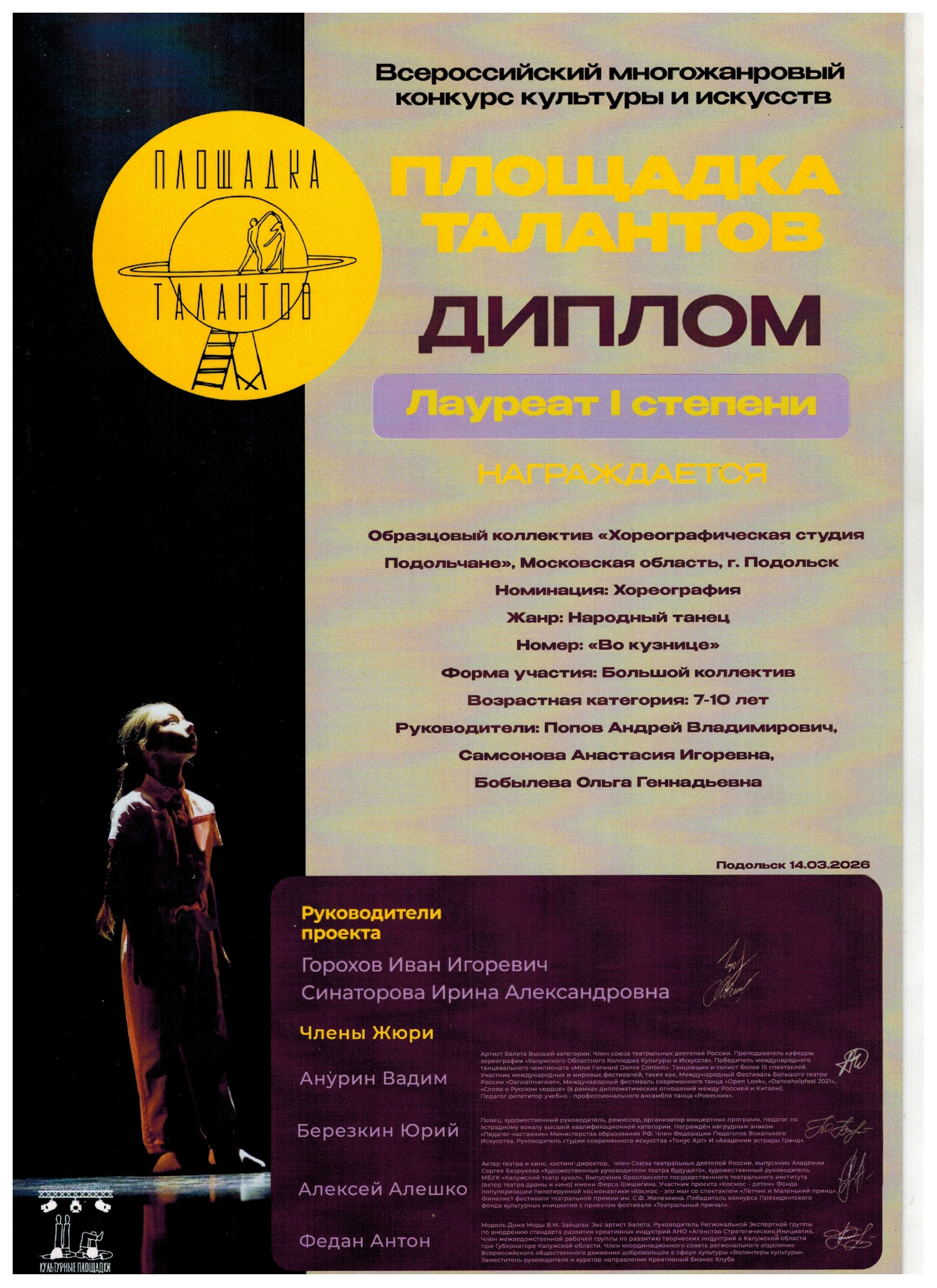 14 марта Хореографическая студия «Подольчане» успешно выступила на Всероссийском конкурсе культуры и искусств «Площадка Талантов» Образцовый коллектив хореографическая студия «Подольчане» представил на суд жюри девять хореографических номеров.