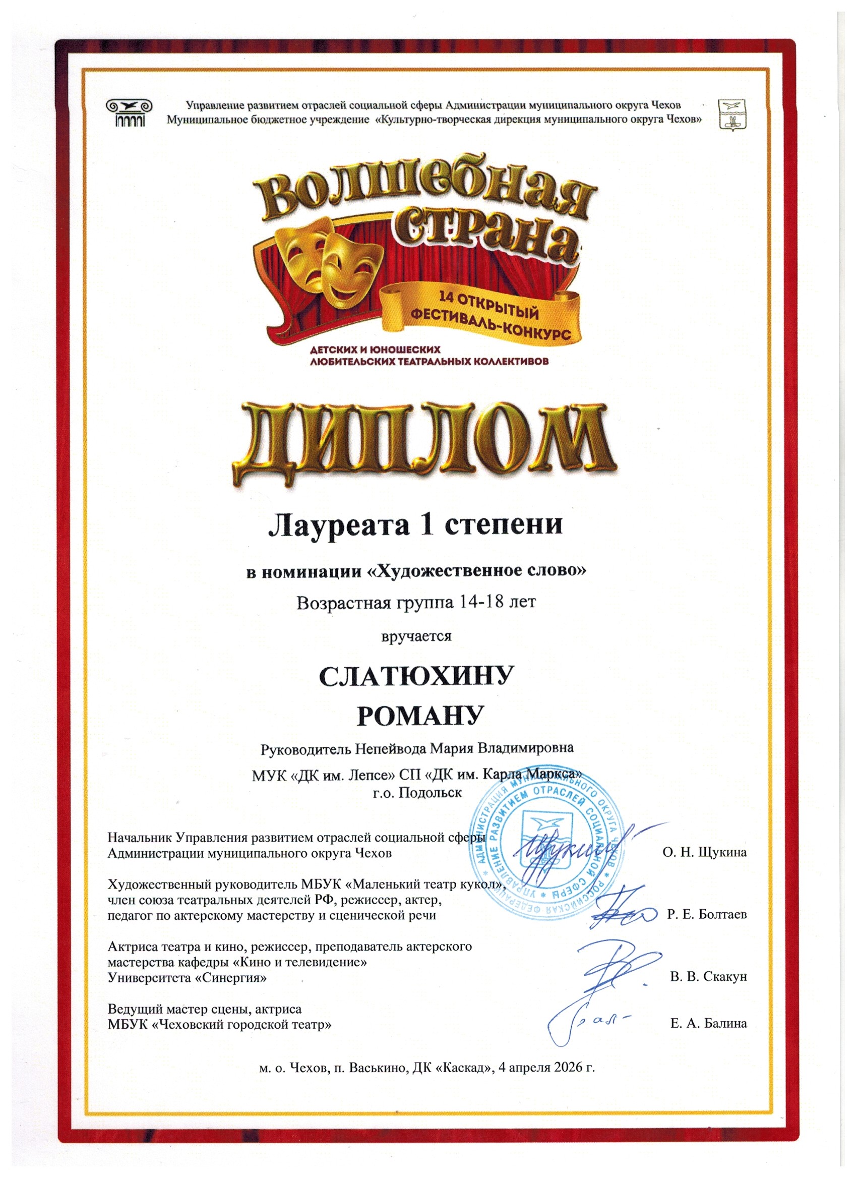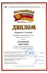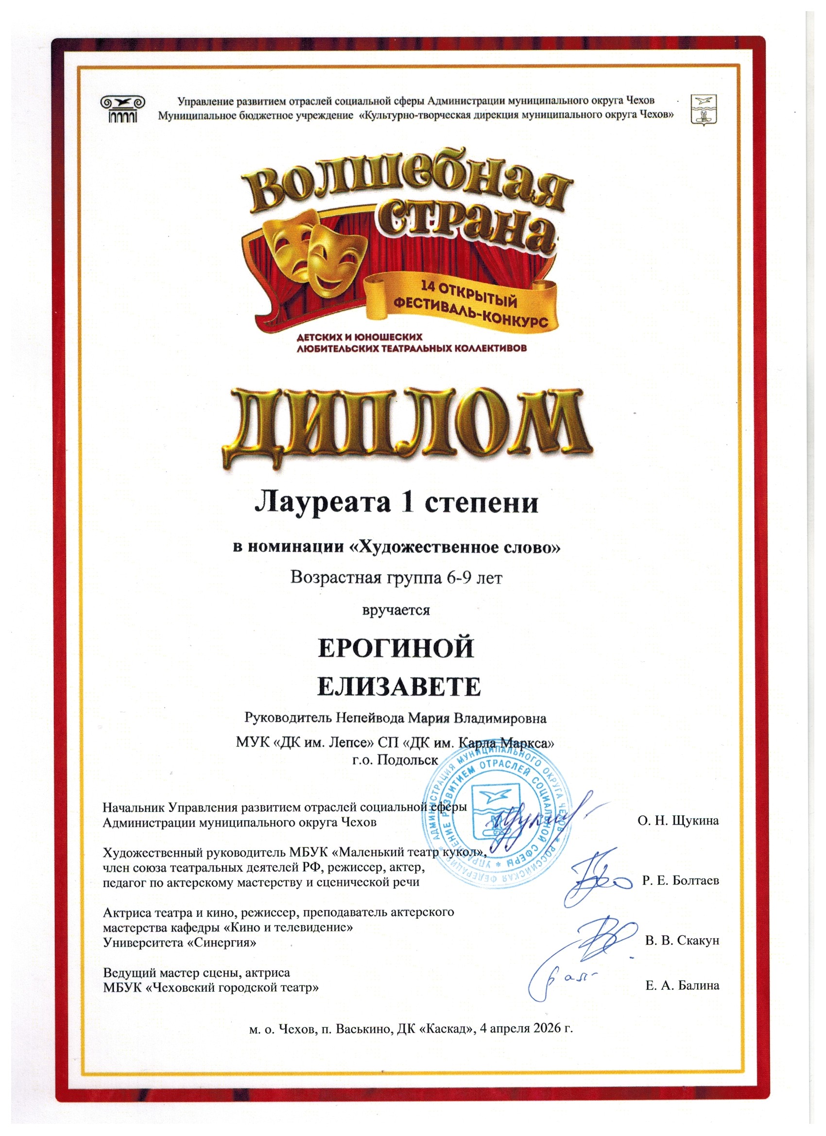 В номинации «Художественное слово» Лауреатами I степени стали: Роман Слатюхин (возрастная группа 14-18 лет), Елизавета Ерогина (возрастная группа 6-9 лет), Виктория Коровина (возрастная группа 10-13 лет).