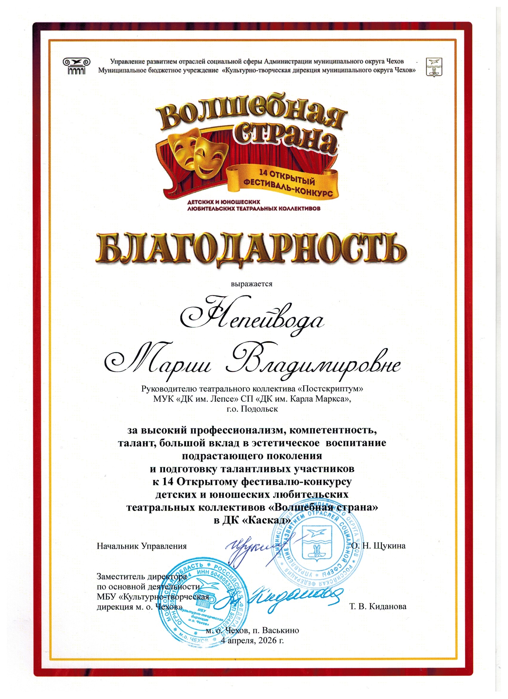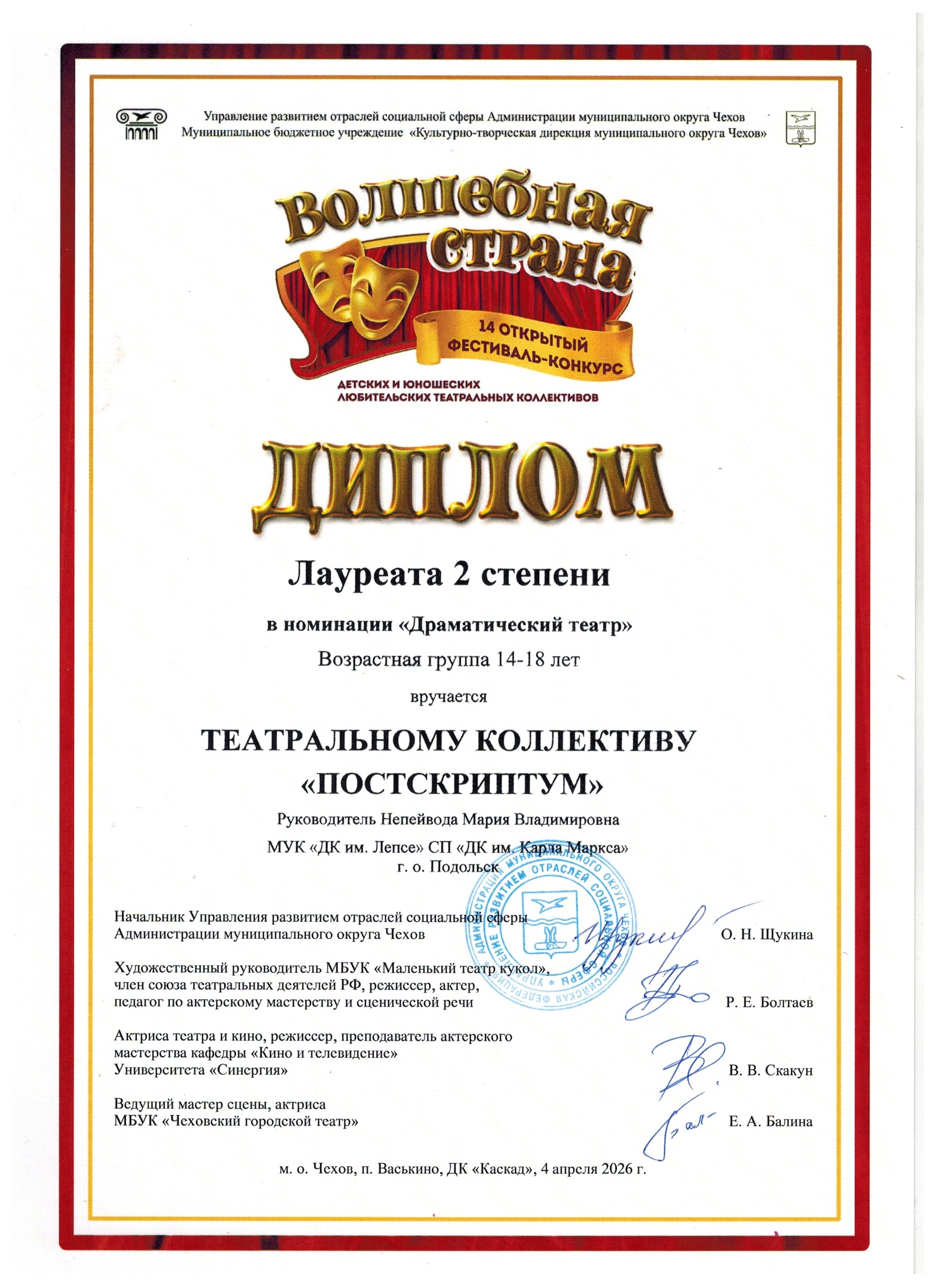 5 апреля Старшая и Младшая группы «Постскриптум» ездили на XIV открытый фестиваль-конкурс детских и юношеских любительских театральных коллективов «Волшебная страна» при поддержке МБУ культурно-творческой дирекции муниципального г.о. Чехов. Фестиваль проходил на базе ДК «Каскад», п. Васькино.