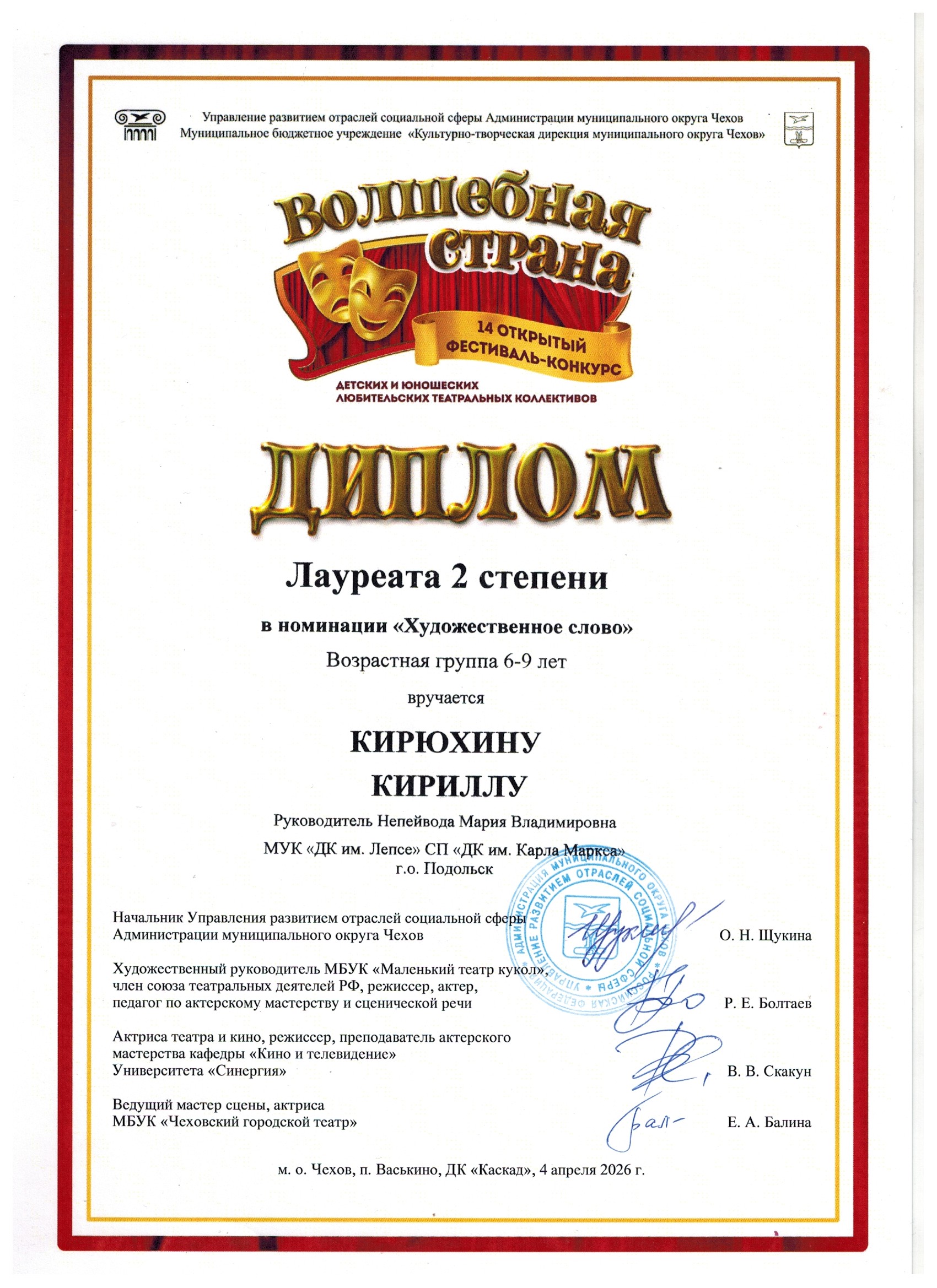 Лауреаты II степени: Фёдор Тригуб, Кирилл Кирюхин (возрастная группа 6-9 лет).